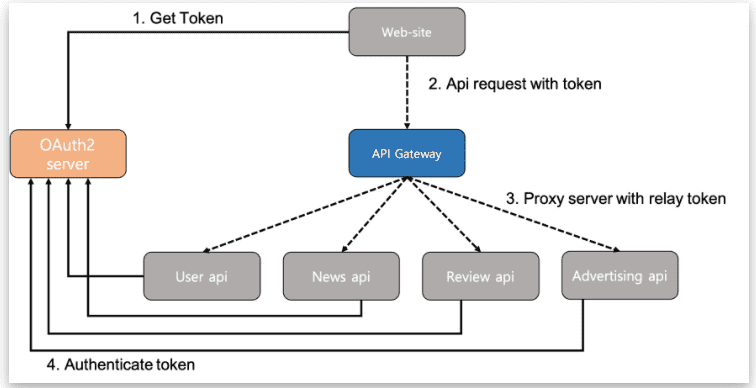 api gateway에서 인증을 수행하고 뒤쪽에 실제 기능이 있는 API로 연결하는 방법입니다. 아래는 AWS를 사용한 사례이지만 구성 자체는 비슷하다고 이해하시면 좋을 듯 합니다. gateway를 통과할때마다 인증을 수행하는 방식입니다. 허용되지 않는 API 요청을 수행하는 경우에는 403을 반환합니다.