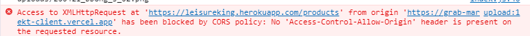 원인은 models/products.js 에서 soldOut 항목 defaultvalue 철자가 틀려서 에러가 뜨는거였습니다. 근데 cors 문구가 왜떳는지는 모르겠네요 암튼 감사합니다 ㅎㅎ