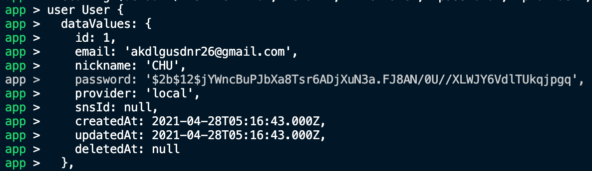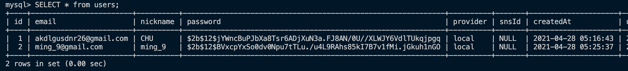 아래 부분은 mysql 접속해서 알아본 users 데이터입니다.
