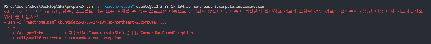 파워셸 말고 git bash같이 ssh가 깔려있는 터미널로 하셔야합니다. 아니면 파워셸에 ssh를 설치하시거나요.