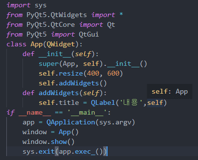 예를 들어 QLabel("내용", self) 라고 하면 self는 현재 실행되고 있는 인스턴스App(Qwidget)를 가리키게 됩니다. 즉, 어디에 부착할지(부모)를 명시하게 되는 것이죠.