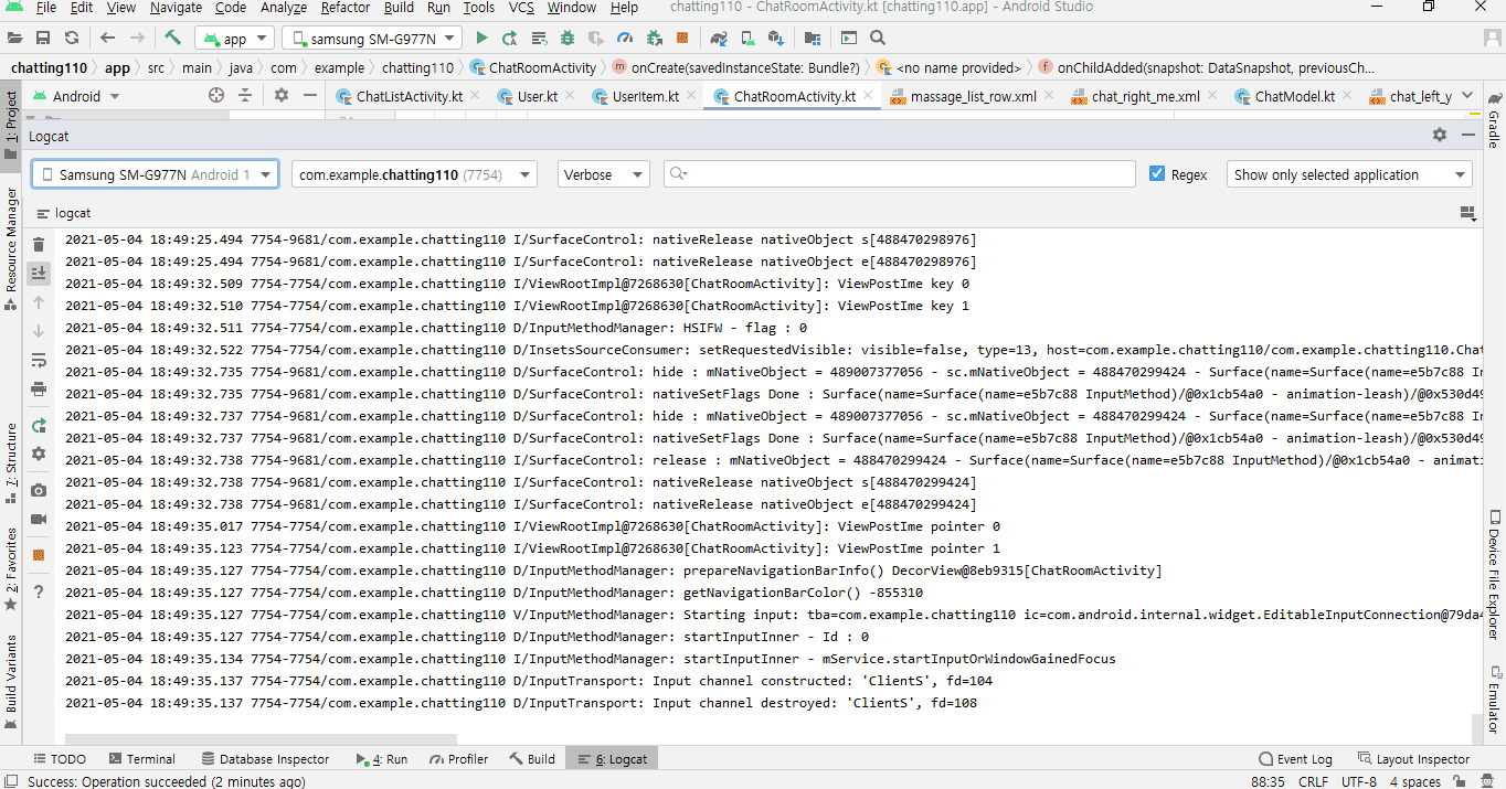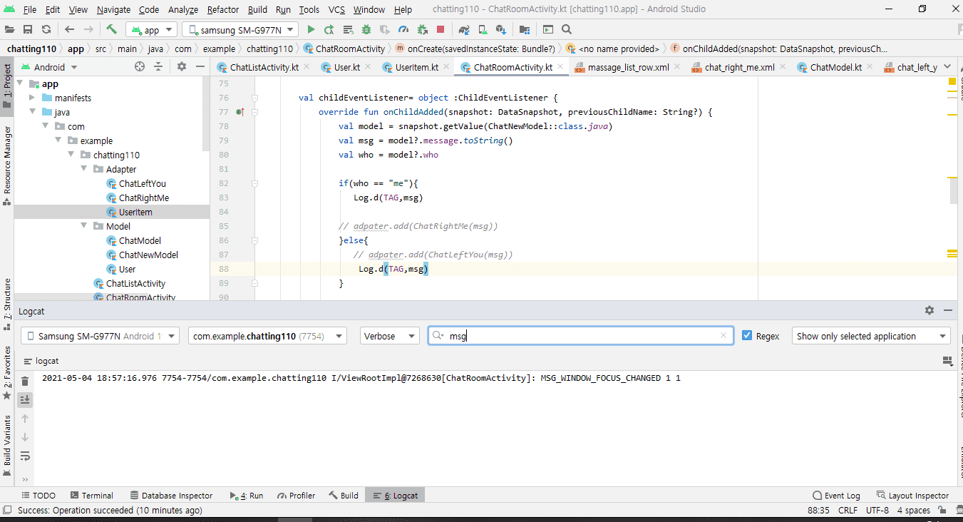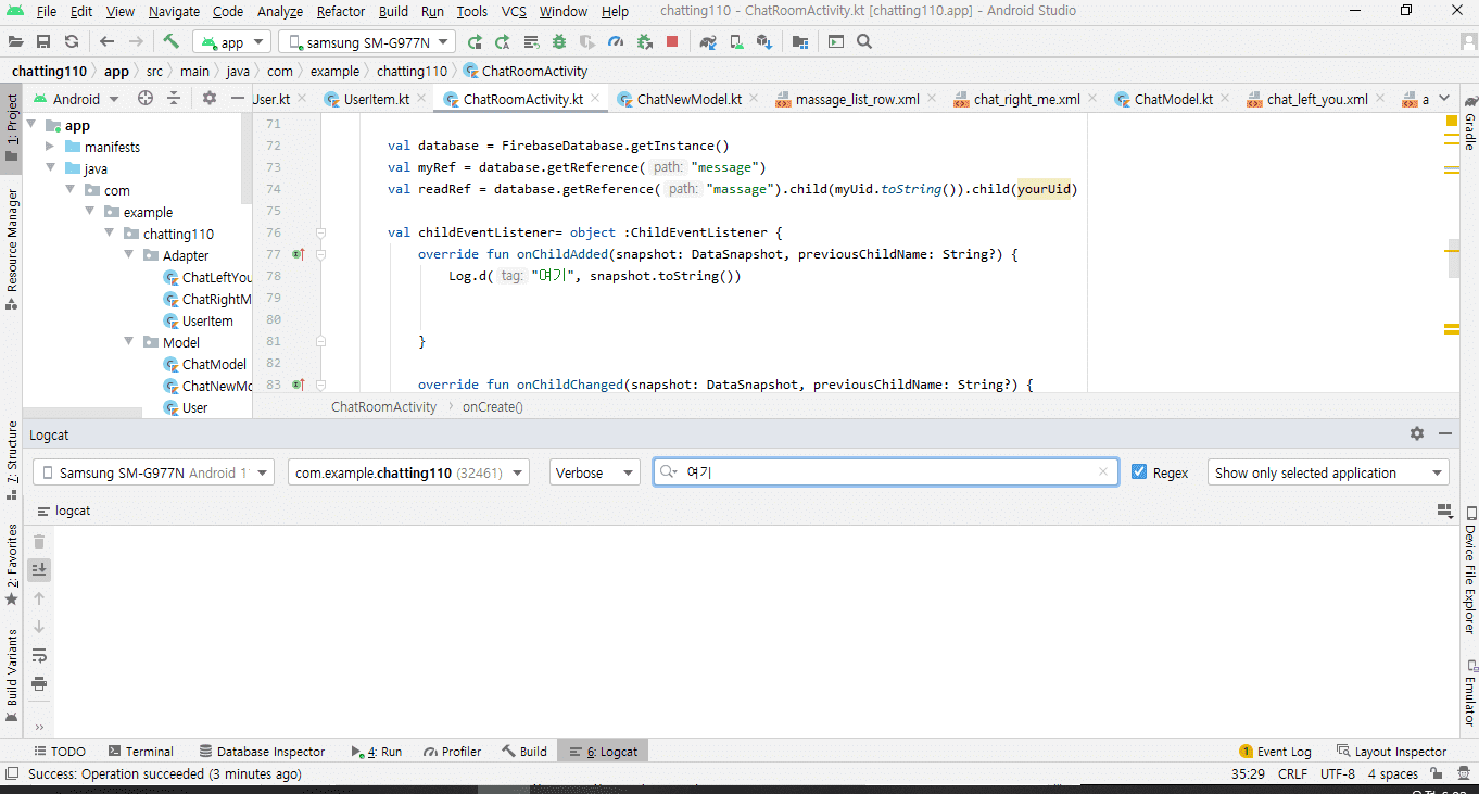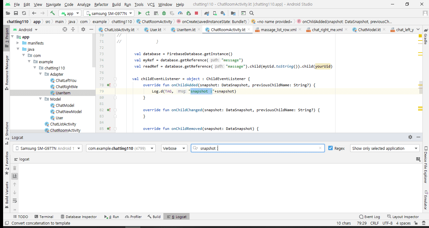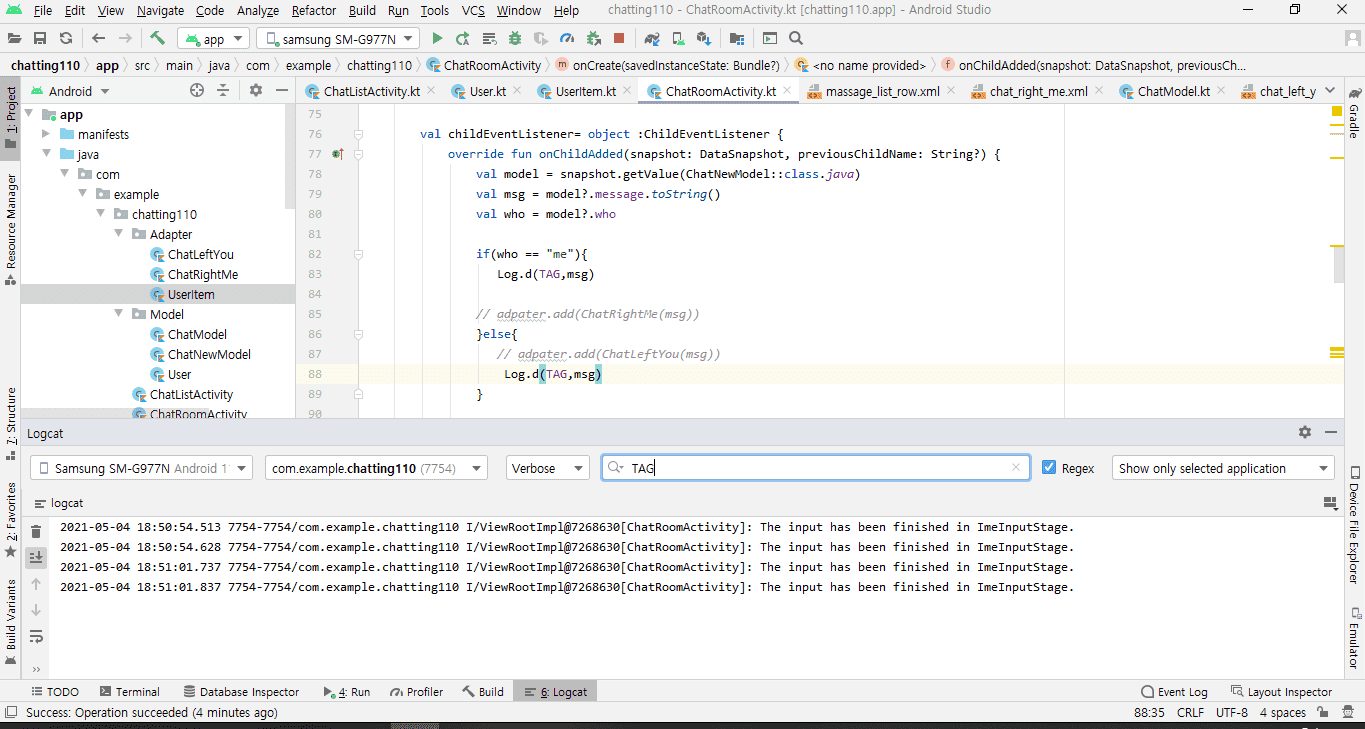 그다음 전에 문제였던 부분 글자 입력해도 표시가 되지않는다고 질물했는데, 파이어베이스에 어뎁더 제대로 연결 안되어 있다 하셔서 말씀대로 Log.d(TAG.msg)했습니다.