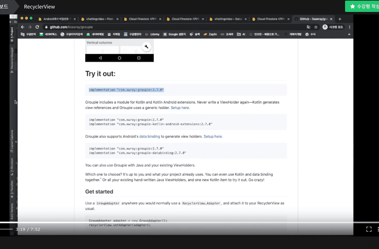 여기에서는 GroupieViewHolder라는 명령어가 자동입력이 되지 않고 빨간색이 뜹니다.
