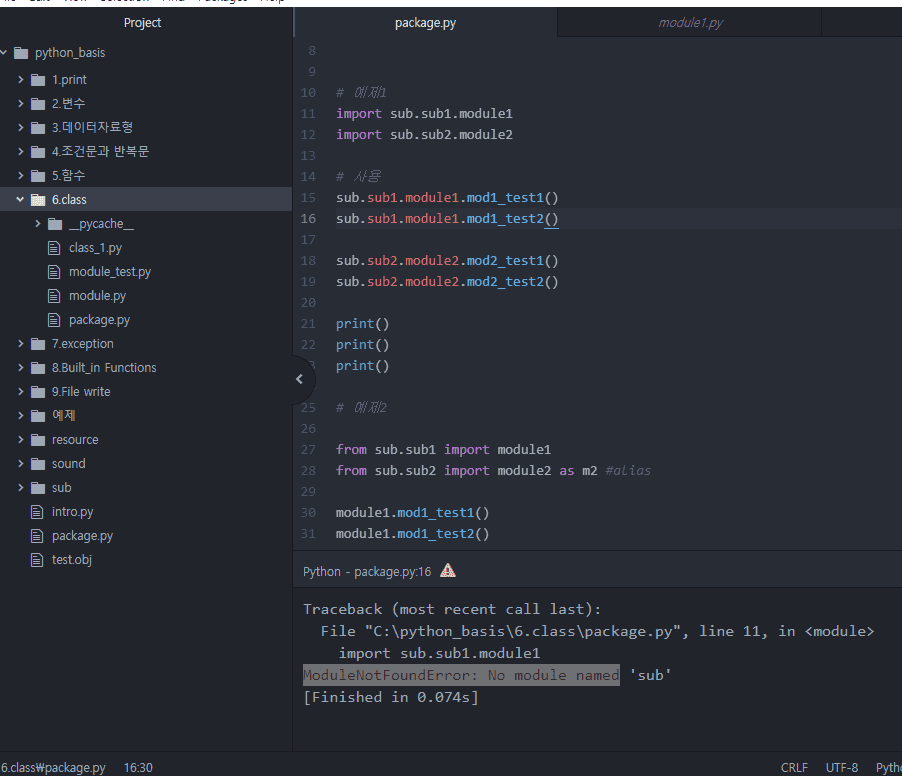import .sub.sub1.module1 이렇게 import 경로를 바꿔보니 이러한 에러가 뜨네요..(첫번쨰 사진 참고)