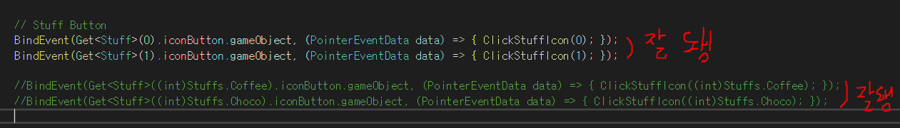 문제는 enum값을 따로 써주면서 BindEvent를 하면 잘 되는데, enum이 너무 많아 반복문을 써서 Event를 등록하면 잘 안돼는 현상이 발생하는데, 원인을 잘 모르겠습니다.