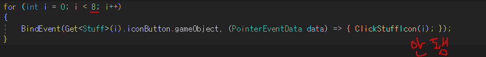 심지어 반복문에 i <8 이라고 써서 i가 총 7까지만 되도록 했음에도 불구하고, 저 오브젝트를 눌렀을 때 ClickStuffIcon(int) 에 8이 매게변수로 들어가고 있습니다.. 원인을 계속 찾아보고자 디버그를 했는데, 찾지 못해 질문드립니다..ㅠㅠ