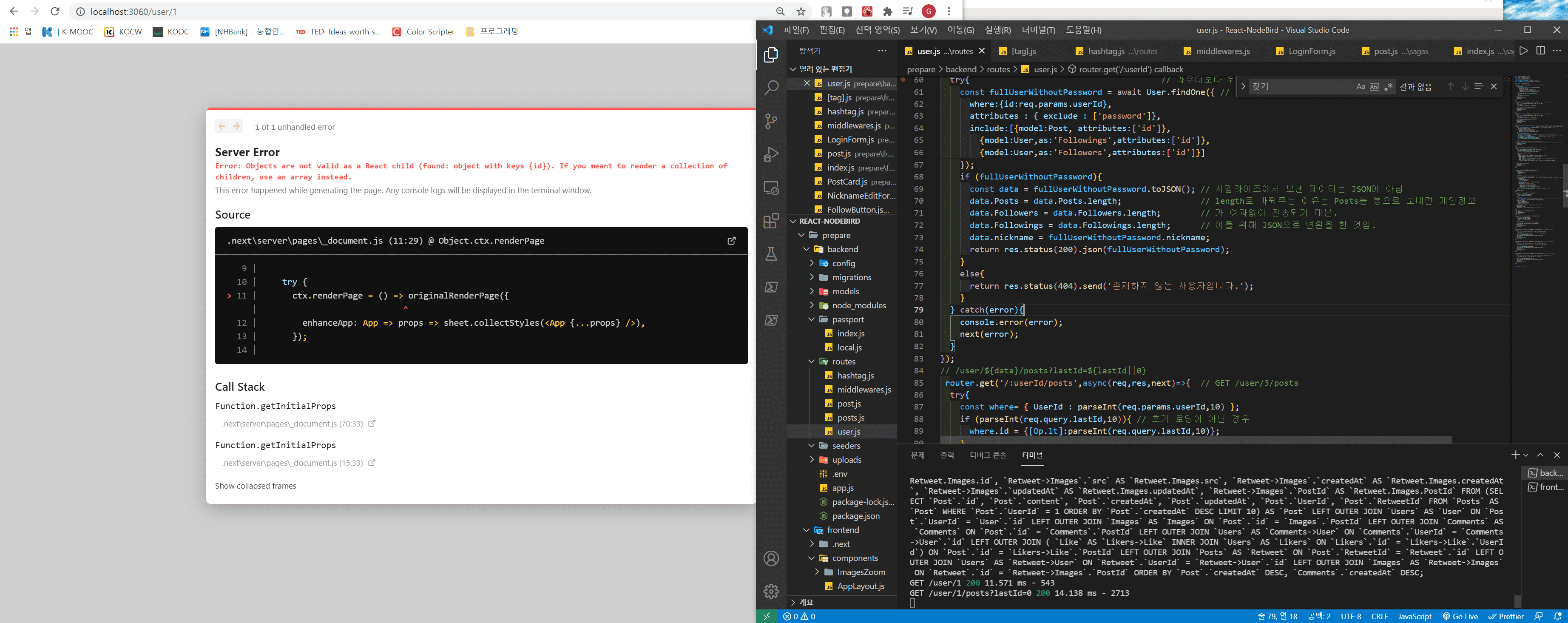 (실제로 에러 발생 파일이 직접적으로 연결된 router/user.js에서 발생하는 것이 아니라 pages/_document.js에서 발생하기 때문에 도대체 어디가 문제인지 쥐잡듯이 찾아보다가 [id].js 파일 서버사이드렌더링 부분에서 LOAD_USER_REQUEST디스패치를 주석처리하고 돌려봤더니 잘 돌아가길래 거기서 힌트를 얻어서 겨우 파악했습니다ㅠ)