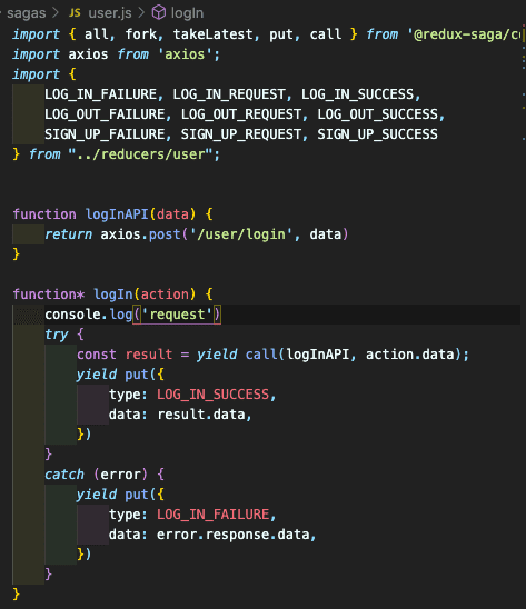 로그인 기능을 구현하면서 LOG_IN_SUCCESS가 실행이 되지 않는 상황입니다.