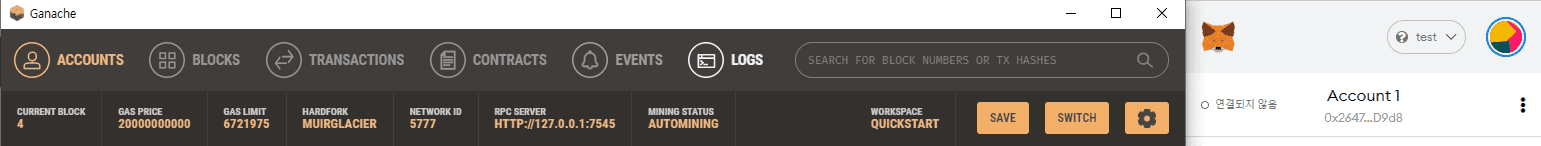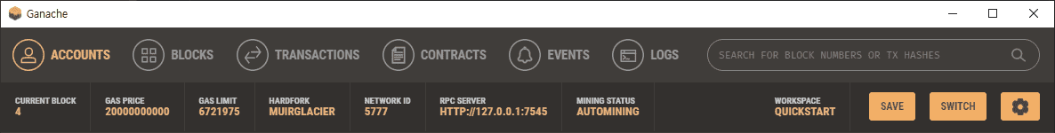 ganache gui의 quick start를 통하여 위와 같이 실행하였습니다.