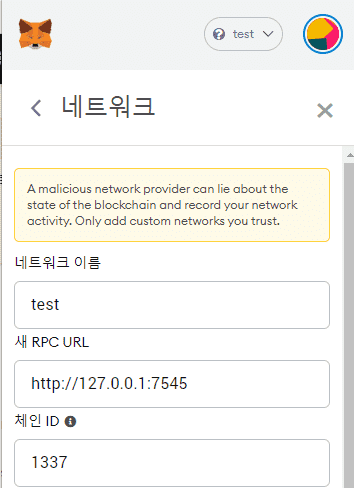 그 후 metamask에서 rpc 네트워크를 추가하였습니다. (chain id의 default 값이 1337이라고 하여 1337으로 설정함)