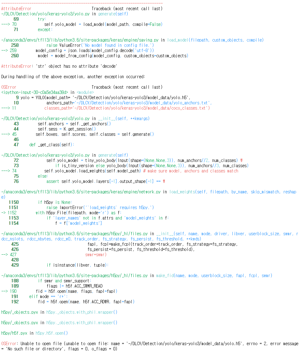 일단 /home/compu/DLCV/Detection/yolo/keras-yolo3/model_data 디렉토리 밑에 yolo.h5 파일이 있는지 먼저 확인 부탁드립니다.