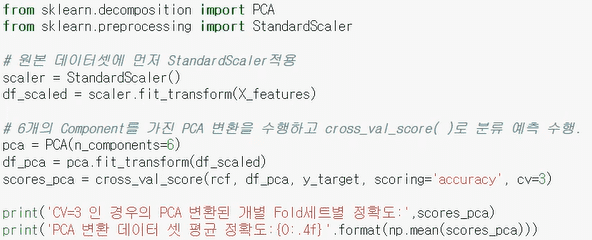 해당 데이터 세트는 feature간의 상관 관계가 높아서 n_components=4 로 해도 성능이 많이 떨어지지 않습니다.