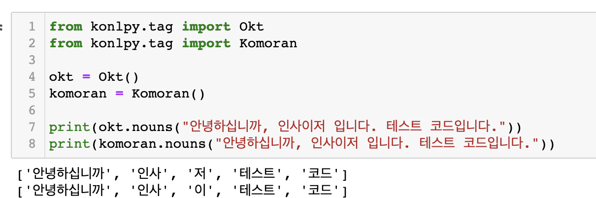 Okt, Komoran 모듈 사용 샘플 코드 공유드리겠습니다.