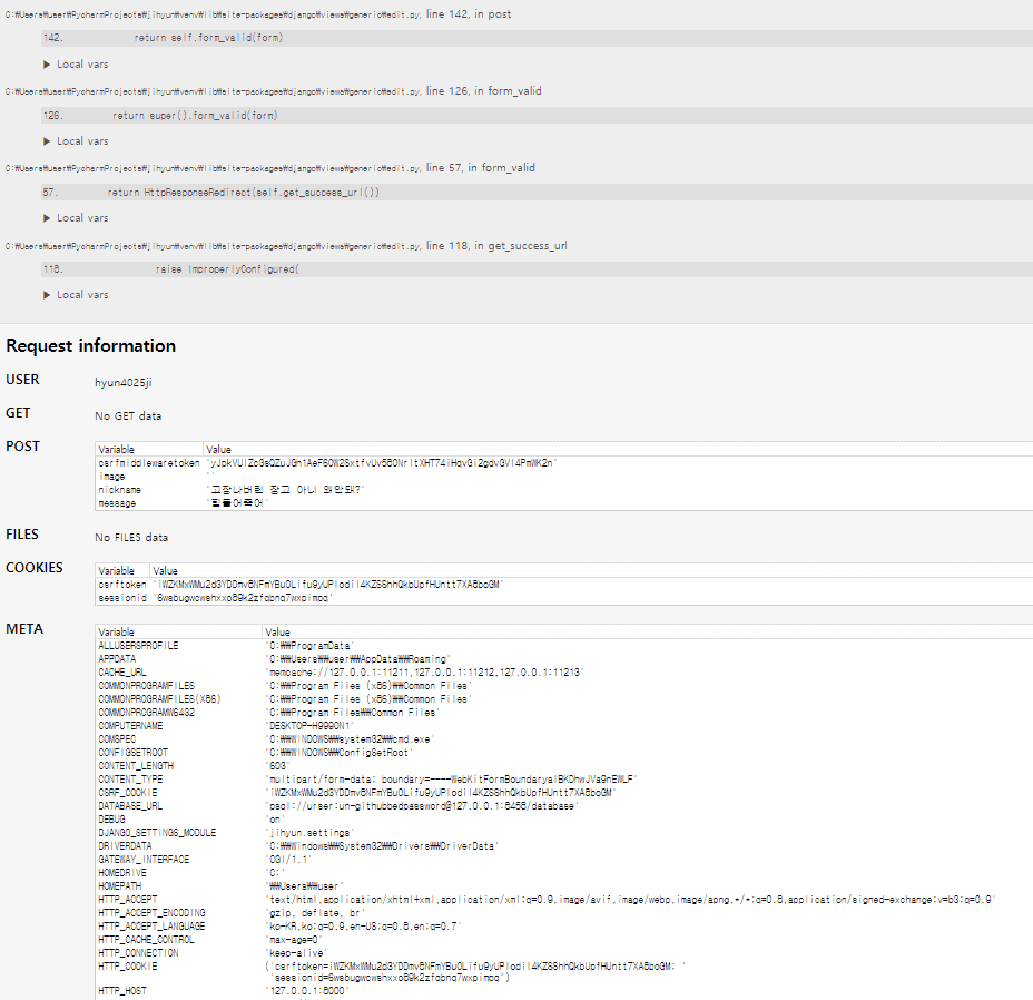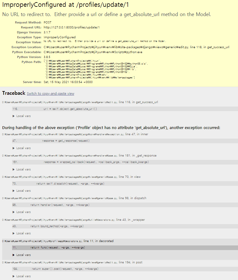 로그인 후 해당 프로필을 만들고 다시 메세지를 변경하고 싶어서 바꾸고 난 후 edit을 누르는 순간 수정이 안되고 에러가 나는데요,