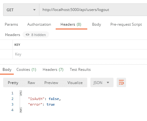 POSTMAN에서 GET 메세지로 아무런 인자 없이 Send를 하면 아래 이미지와 같이 isAuth: false가 뜹니다.