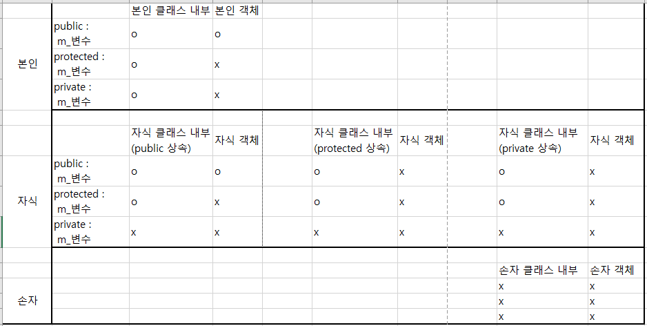부모의 protected 멤버 변수 👉 자식 클래스에서는 private 멤버 변수 👉 손자 클래스에서 사용 불가능