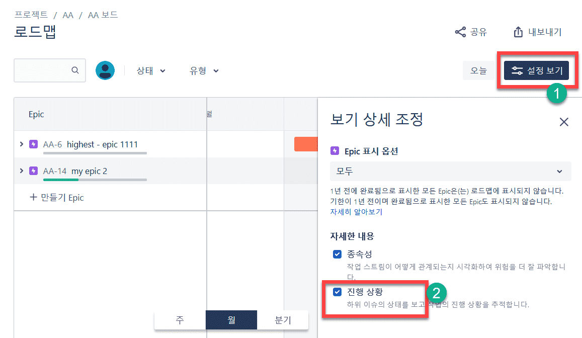 로드맵 화면에서 우측 상단의 "설정 보기" 에서 "진행 상황" 을 체크했는지 확인해 보세요.