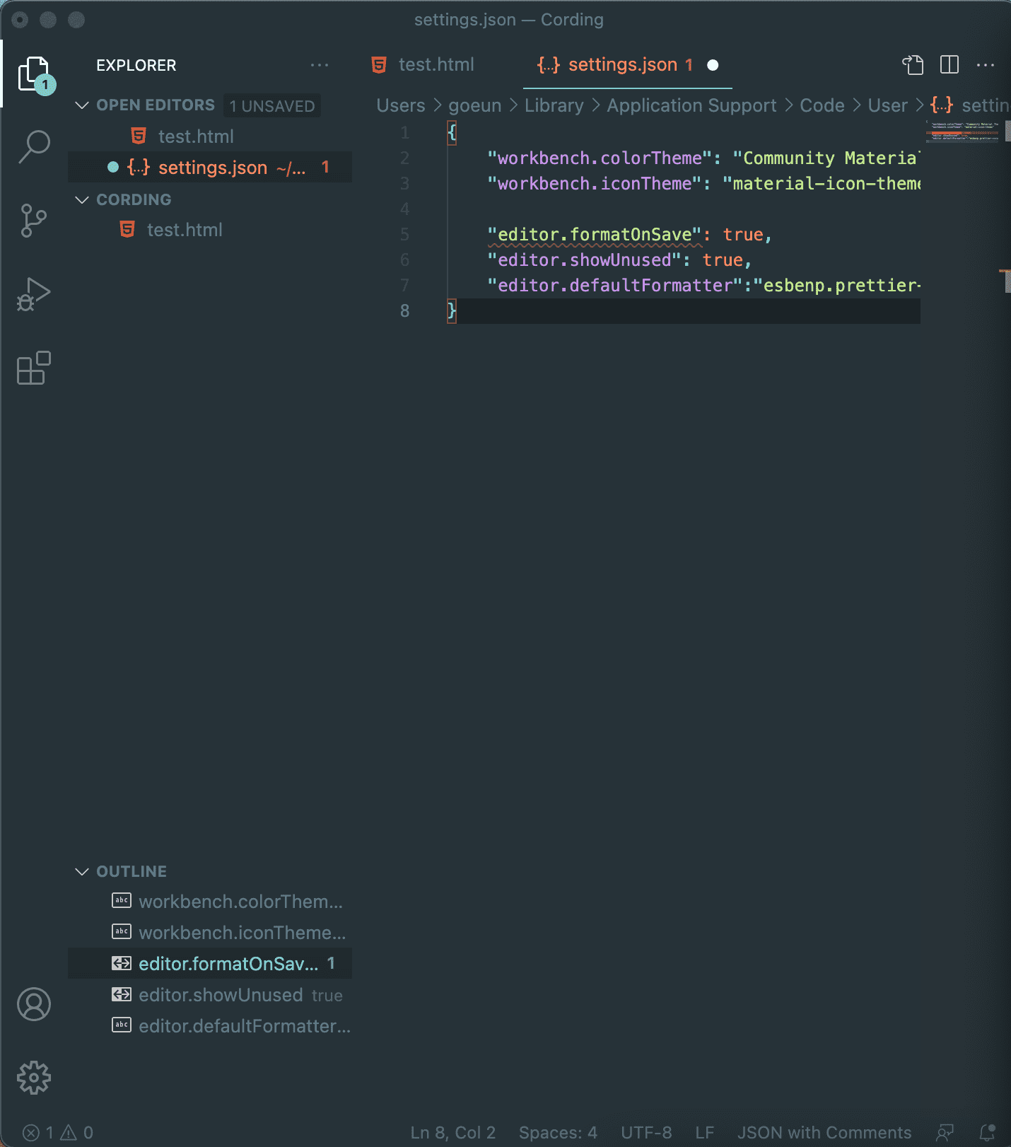 3번째 줄인 workbench.icontheme 마지막에 ,가 붙어있는지 확인해주세요~!