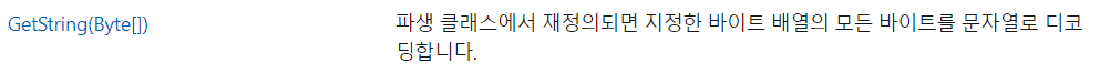 오늘 배운 내용을 안보고 코딩해보려니까, 보낼 때는 문자열을 바이트로 바꾸는 거나까 Encoding이 맞지만 받을 땐 그 반대 뜻인 Decoding이 맞지 않나...?라는 생각이 듭니다. 그래서 Encoding.UTF8.GetString(...)이 생각이 잘 안나더라구요.