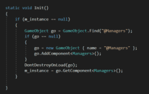 제 예상으로는 위 코드가 아예 실행이 되지 않고 있는 상황으로 보입니다.로그를 찍어보거나 breakpoint를 걸어서 Managers의 Init()이 호출되는지 확인 바랍니다.강의 코드에서는 최소한 한 번 초기화 하도록위 부분에다가 Init();을 한 번씩 넣어놨을꺼에요.