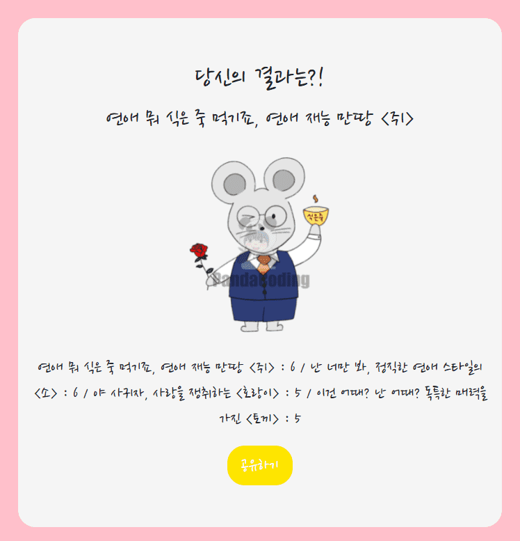 1. 결과 페이지 상세 내용 아래에 데이터의 모든 결과값을 아예 나타내주는 방법이있을까요? (쥐 4점, 돼지 3점 ,소 2점 이런식으로)