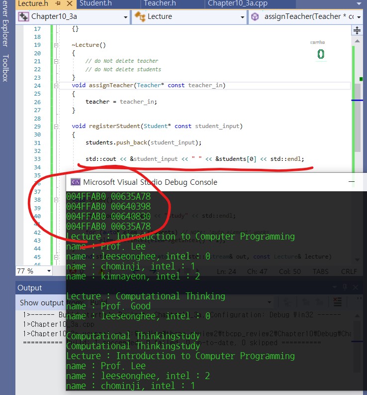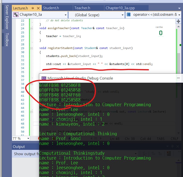 컴포지션때와 다른 게 있다면 student_input의 주소가 004FFAB0로 모두 동일하다는 겁니다.