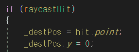 raycastHit이 된 오브젝트의 y축좌표를 0으로하면 머리꼭대기? 로 _destPos의 y축 좌표가 설정이 되니까(capsule collider의 좌표가 그냥 머리 꼭대기)