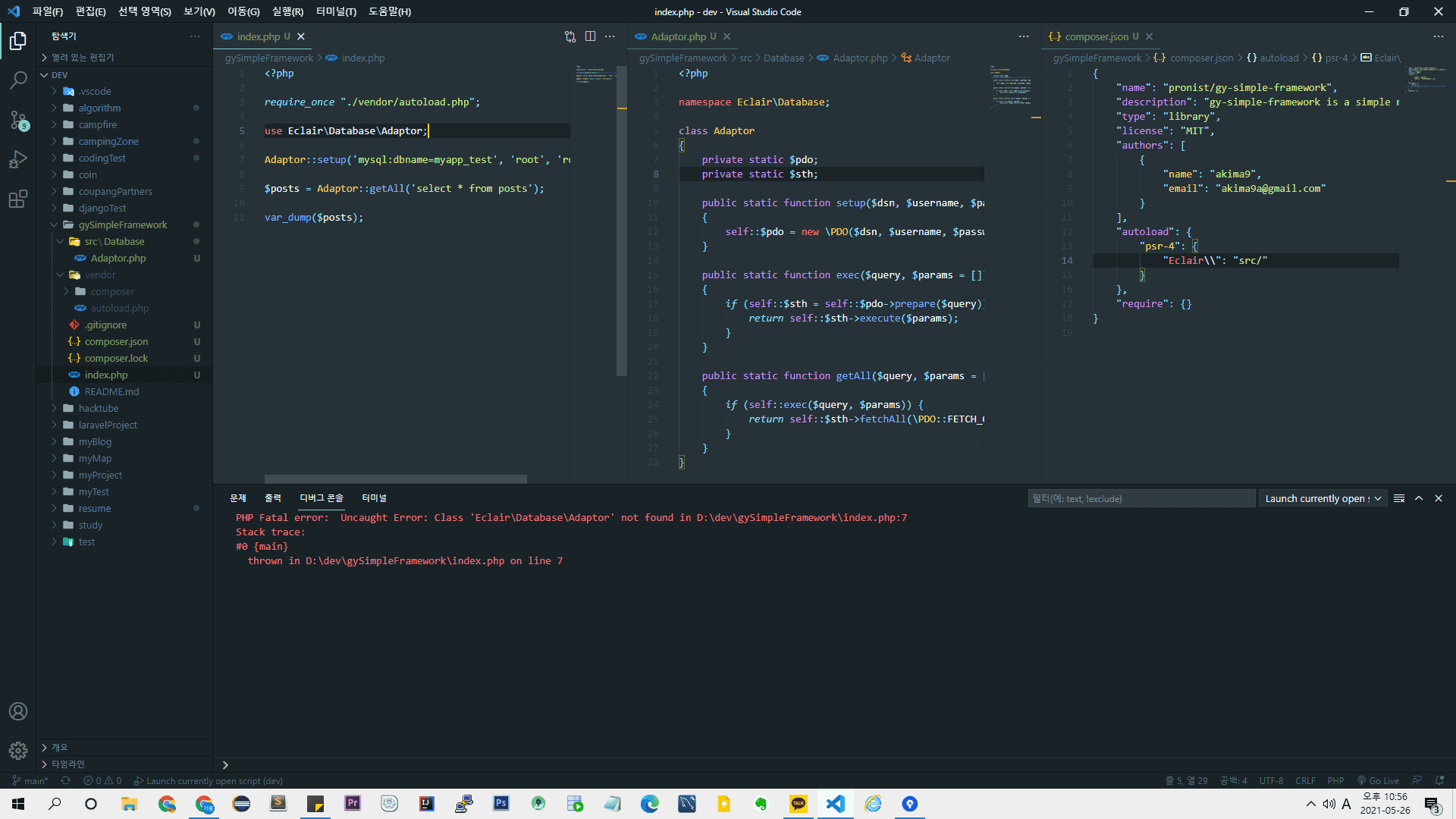 안녕하세요. 답변이 늦어 죄송합니다. 흠, 이해가 되질 않는군요. 분명 저 상태라면 정상적으로 동작하여야 정상입니다. 클래스가 로드되지 않는 경우는 1. 스펠링이 틀렸거나, 2. composer 에 무언가 이상이 발생했거나 인데, composer.lock 과 vendor 파일을 지우고 재설치 해보는 것도 방법입니다. composer 1.x, composer 2.x 에서 동일하게 실행해본 결과로는 모두 정상적으로 작동한 것을 확인했습니다.