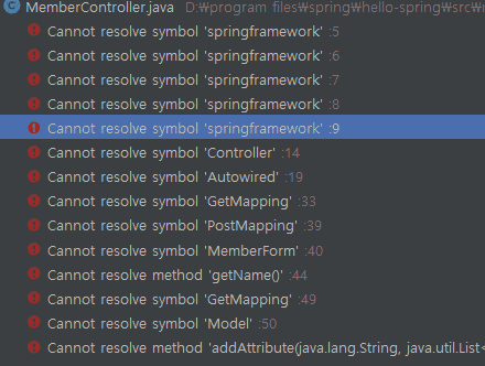 그리고 기존에 spring 프로젝트를 다른창에서 열었는데 다음과 같이 스프링프레임웍을 불러올 수 없다는 오류 메시지를 확인했습니다. 혹시 저 위의 과정에서 문제가 생긴건지 다른 이유가 때문에 그런건지 궁금합니다 . 도움 부탁드립니다~~~~~!!