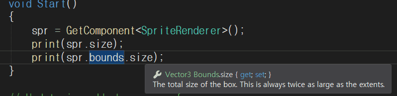 size 는 Vector2 이고 bounds.size 는 Vector3 인데 저희가 현재 사용하는 값이 x값만 있죠.