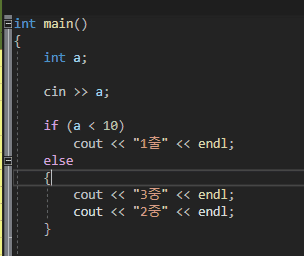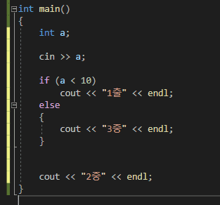 만약 11이 아닌 a < 10 에 해당하는 7 을 입력하셨다면 마찬가지로 cout << "1출" << endl; 와 cout << "3중" << endl; 을 함께 출력할거에요.