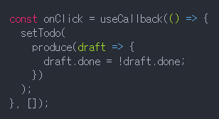 produce(draft => {}) 함수의 리턴값이 (prevState) => {} 입니다. 그래서 최종적으로는 setTodo((prevState) => {}) 꼴이 됩니다.