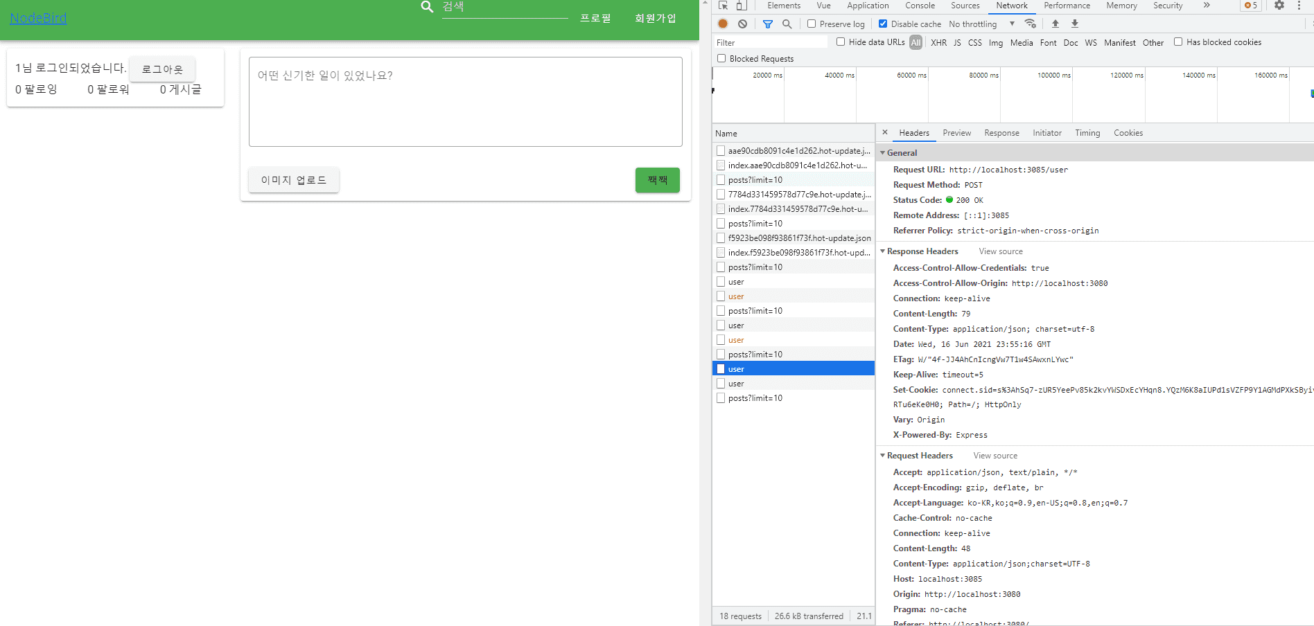 그리고 LoginForm에서 Index로 바뀌면서 불러와진 이미지들은 Request Headers에 쿠키가 표시되지 않고, POST /post 또한 Request Headers에 쿠키가 나와있지 않습니다.