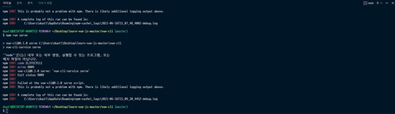 안녕하세요 시온님, bash 터미널에 Node.js 관련 경로가 추가가 안되어서 그런 것 같아요. 아래 추천 드리는 콘솔 에뮬레이터 사용해 보시거나 VSCode 내부에서 실행하는 터미널의 종류를 bash 이외의 종류로 바꿔보시는 걸 추천드립니다 :)