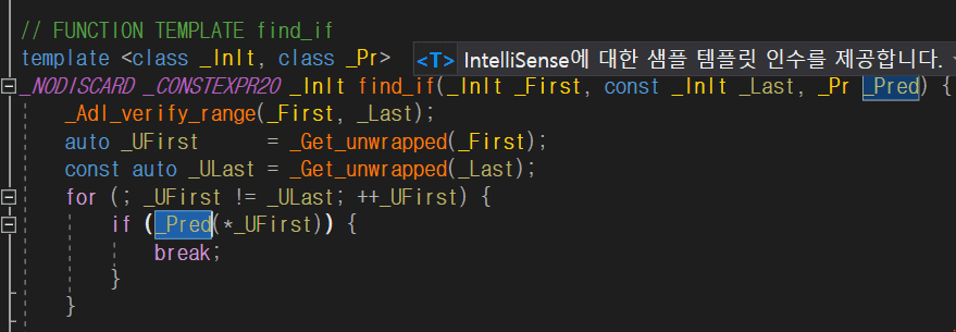 find_if 코드를 보면 _pred(*_UFirst) 부분에서