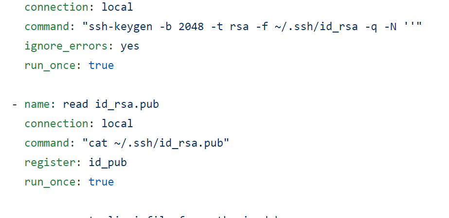 ansible 코어에서 노드들을 컨트롤 할 때 비밀 번호를 입력하는 과정을 스킵하여 최대한 편리하게 사용하기 위해 rsa_public 키 값들을 노드들의 authorized_keys 에다가 전달하려하는 개념까지는 이해가 잘 됐습니다.