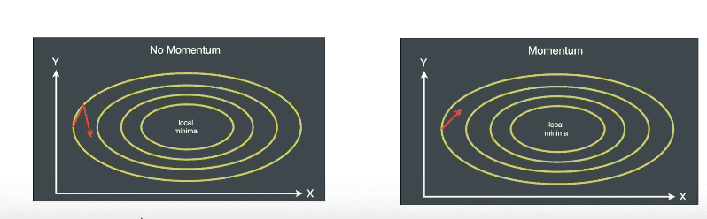 축이 x축, y축으로 되어 있고 최소점(여기서는 local minimum으로 표시된 지점) 까지 x와 y값을 업데이트 하면서 이동해서 찾아야 하는데, y방향으로는 작게 움직이고, x 방향으로는 상대적으로 크게 움직이면 보다 빠르게 최소점까지 이를 수 있는데, SGD가 Random 하게 x, y 값을 기반으로 Gradient를 계산해서 지그재그 방식으로 많은 step을 움직여야 하기 때문에 이를 개선하기 위해 momentum 기법이 도입되었습니다.