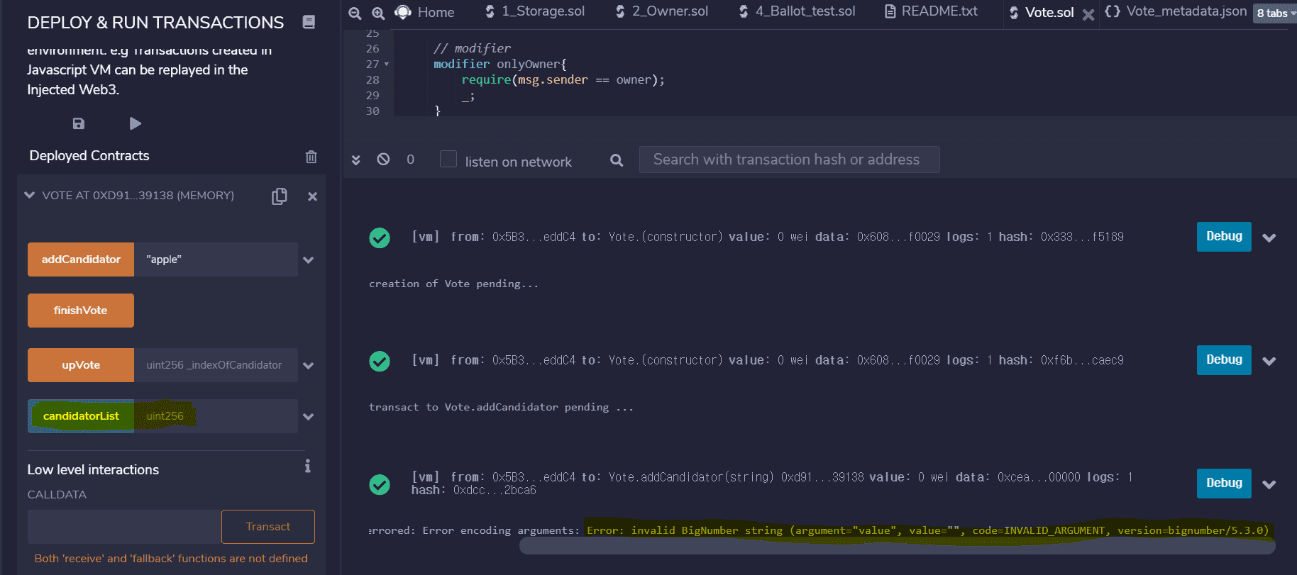call to Vote.candidatorList errored: Error encoding arguments: Error: invalid BigNumber string (argument="value", value="", code=INVALID_ARGUMENT, version=bignumber/5.3.0)
