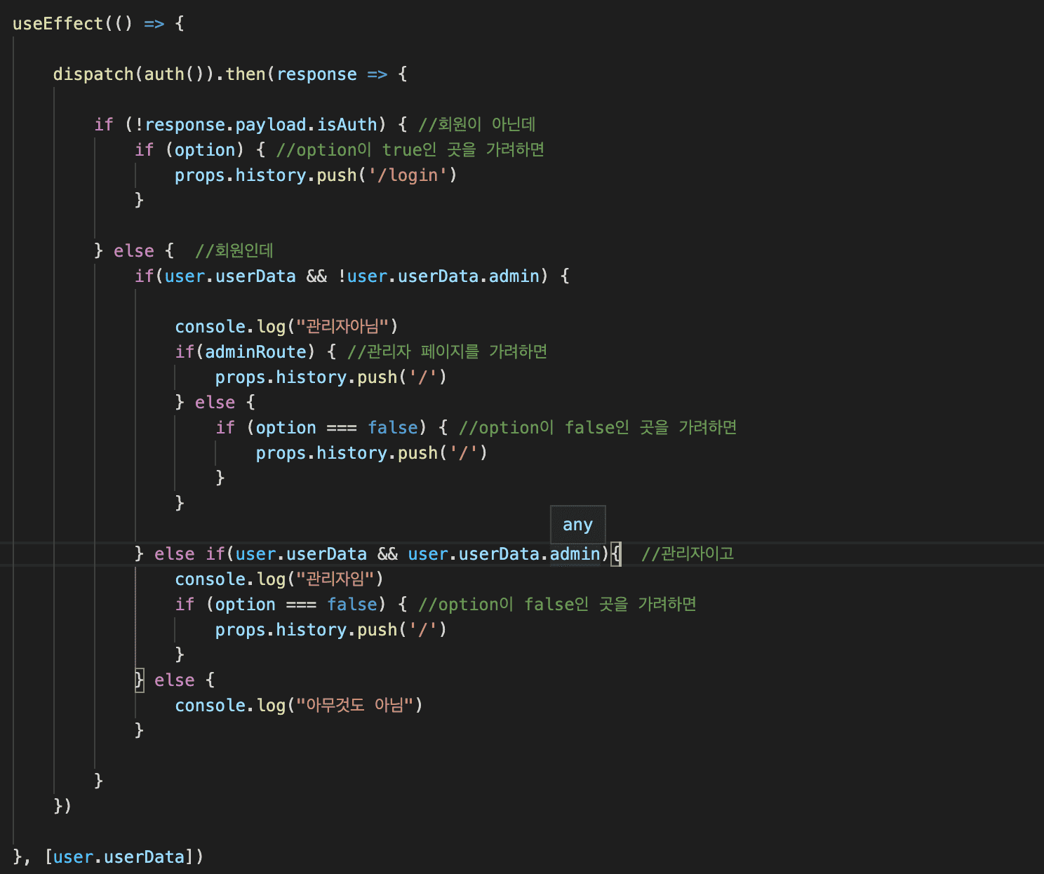 근데 console에 보는 것처럼 계속 랜더링이 되어서 무한루프가 돕니다. 그리고 userData를 인식하기전에는 관리자로 들어가도 관리자가 아니라고 잠시 떳다가 관리자로 바뀝니다. (console에 아무것도 아님) 어떻게 해결할 수 있을까요 ㅠ