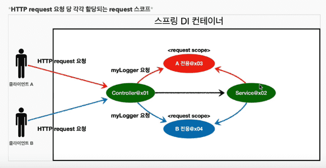 네, 맞습니다. HTTP 하나의 요청이 Controller - Service 순으로 접근하게 되는데, 이미 Controller에서 빈이 생성되었고 Service에서 Provider를 통해 가져오는 빈은 Controller에서 이미 생성되었던 빈을 가져오는 것입니다.
