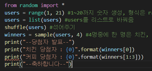 print("커피 당첨자 : {0}".format(winners[1:3] 이라 쓰면, winners 의 2번 인덱스 값 까지만 포함됩니다. 따라서 [1:]이나, [1:4]로 적어야됩니다.