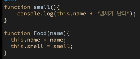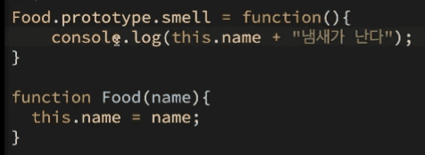 강의 초반에서 언급해주셨듯이... this.smell로 함수로 정의를 하게된다면 인스턴스가 생성될때마다 this.smell 함수가 함께 생성이 될겁니다. 하지만 Food.prototype.smell을 이용한다면 이는 하나의 property(결국 이것은 객체임)만을 바라보기 때문에 가장 중요한 이점이라고 생각합니다.