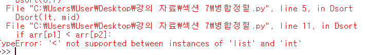tmp=tmp+arr[p1:mid+1] 이렇게 해야 일차원리스트 + 일차원리스트=일차원리스트가 됩니다.