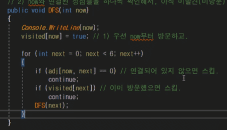 continue; 있는데 이때 now노드와 그다음 next가 연결되어 있지 않아서 스킵하기 위해 작성한것은 이해가 갑니다. 하지만 왜 이렇게 코드를 작성했는지 이해가 가질 않습니다. 왜