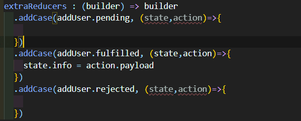 처음엔 fulfilled만 넣어줘서 저런 경고가 뜨는가 해서 위사진처럼도 해보고 저기다가 return state까지 넣어서 해보기도 했지만 계속 같은 경고가 나옵니다.