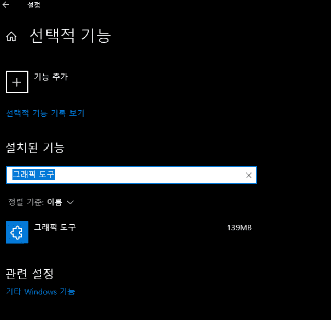 [설정]->[선택적 기능]->[그래픽 도구] 설치가 되었는지 확인이 필요합니다.