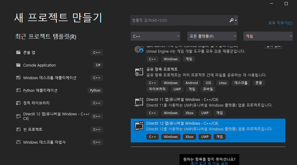 처음 프로젝트 만들 때 directx12 가 있는지도 확인 바랍니다.