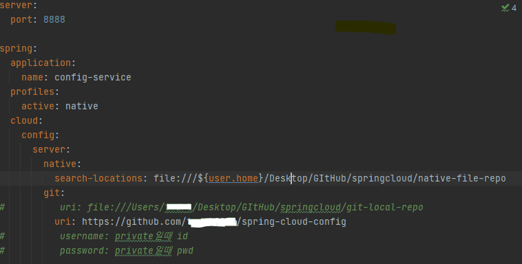 보내주신 내용으로 config-service를 기동하시면, spring.profiles.active=native로 설정되어 있기 때문에, git은 무시됩니다. 만약 profiles.active를 지정하지 않게 되면, 기본값으로 git을 설정하게 되며, git.url이 없을 경우에는 오류를 발생합니다.