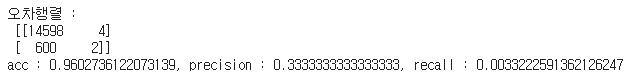 보시면 fn이 600이나 됩니다. recall은 tp/(fn+tp) 그래서 2/602 가 나오게 됩니다. 여기서 fn을 줄여서 tp로 어떻게든 유도해야 하는데, 이럴려면 좀 더 다양한 성능 기법을 적용해 보아야 합니다.