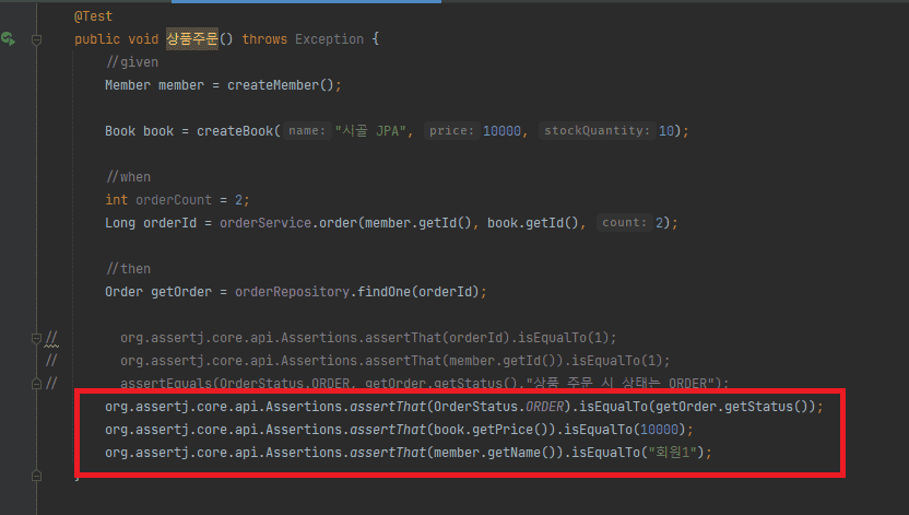 Long orderId = orderService.order(member.getId(), book.getId(), 2);